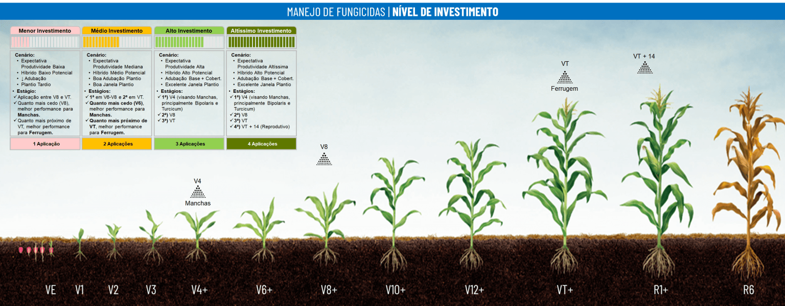 • aplicação do fungicida no estágio V8, quando a planta já tem oito folhas desenvolvidas, ou durante o pré-pendoamento;