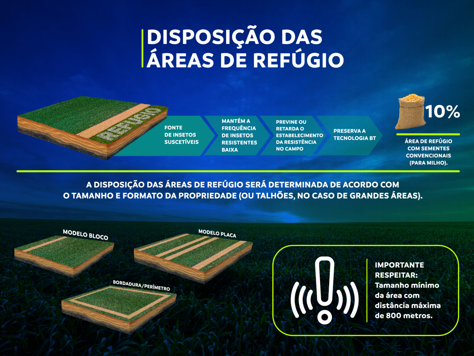Para estabelecer a estratégia de refúgio em sua lavoura, é fundamental garantir que a área esteja a uma distância máxima de 800 metros da plantação modificada geneticamente.